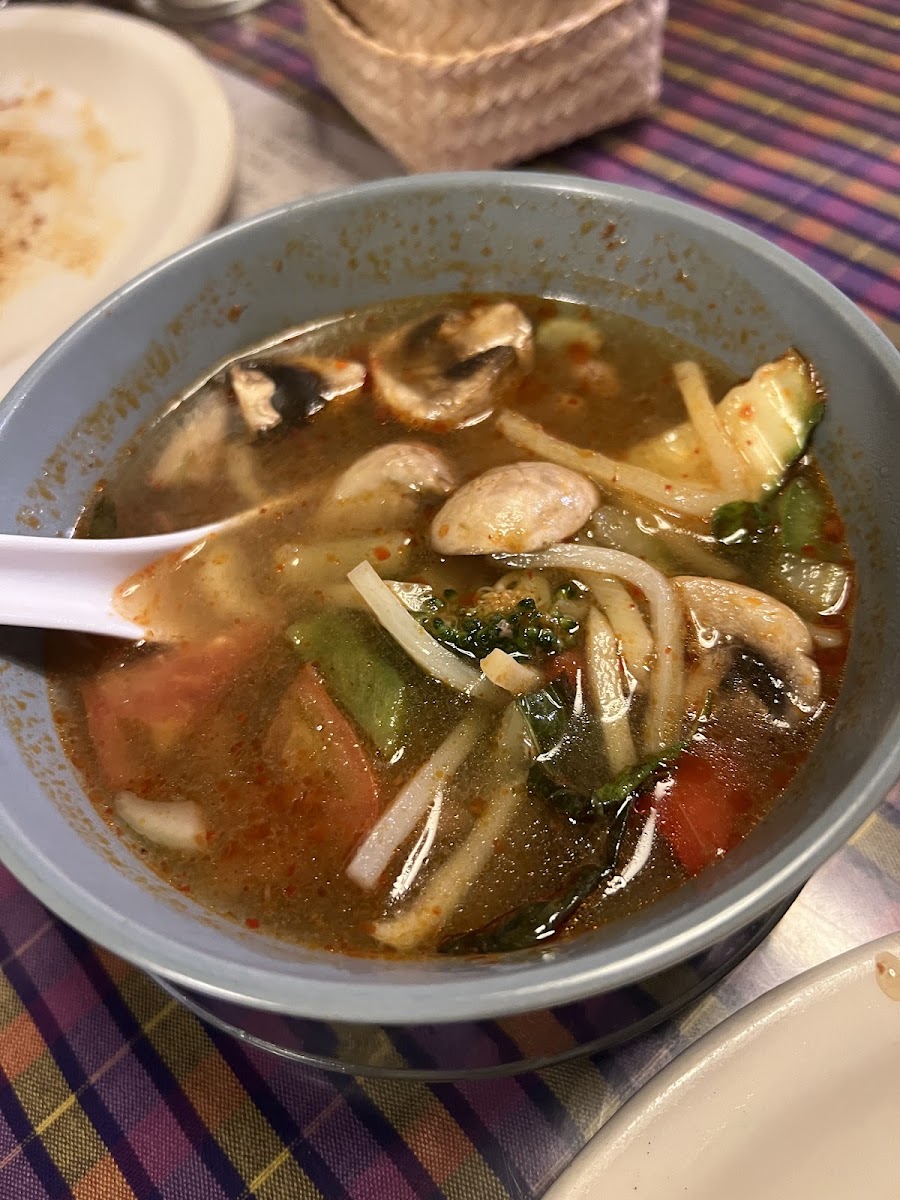 Eating inside is highly recommended. Loved the 60s - 70s Thai music, the exterior and interior decor, the small family feel with the workers and family, the price range, the food presentation, and most importantly, the food and drinks. The Grilled Chicken with veggies and soup were really flavorful, and they have solid Thai coffee. Want to try the lychee iced tea next time.