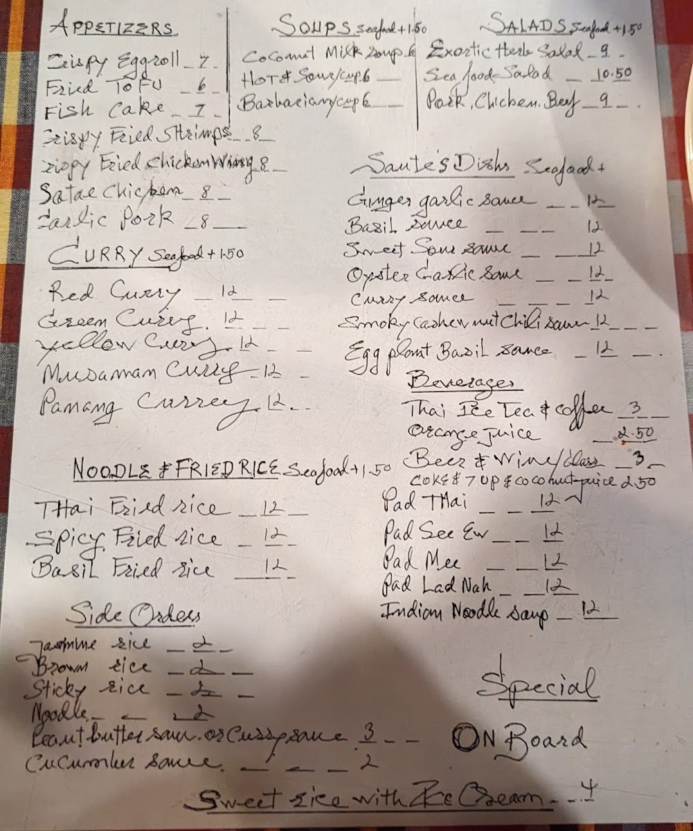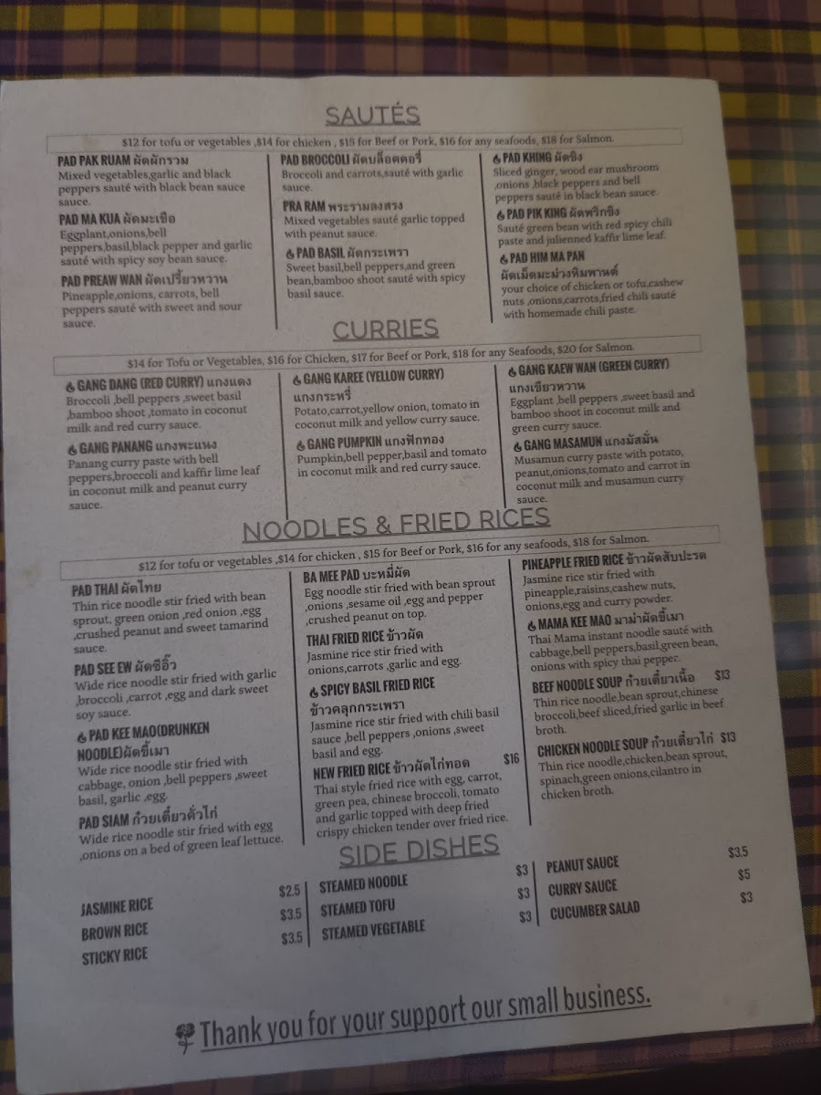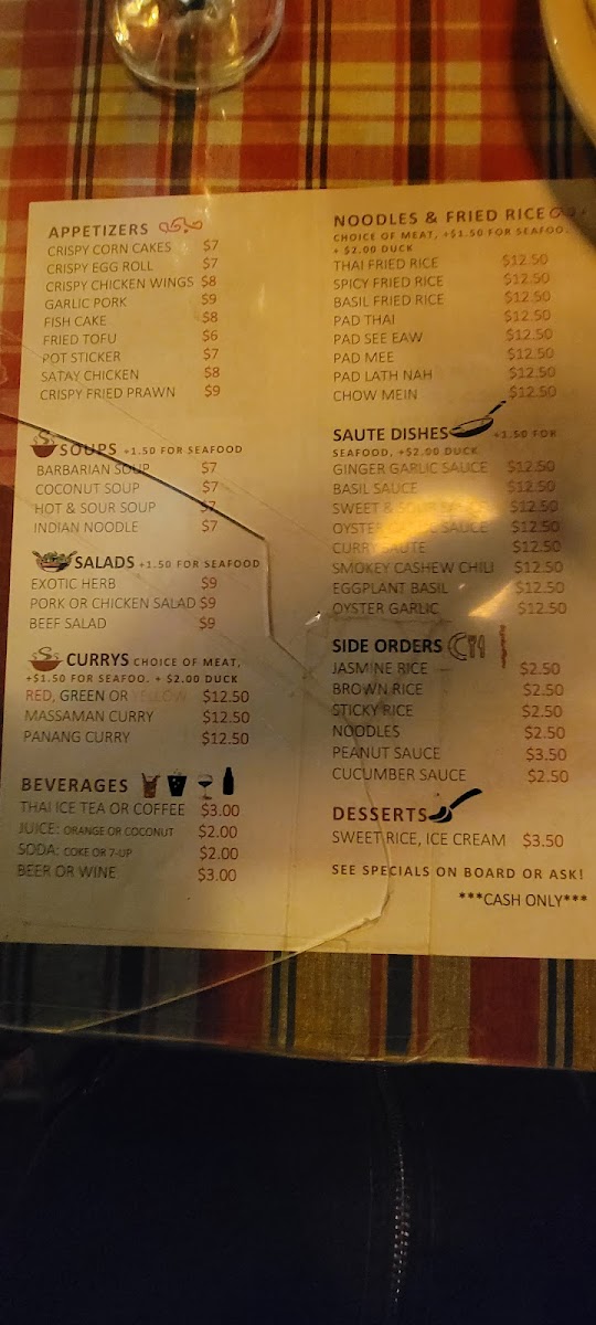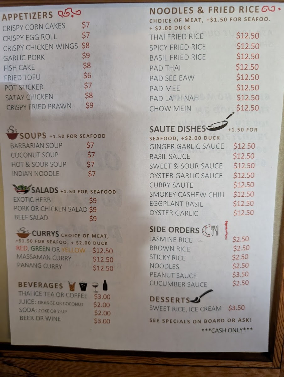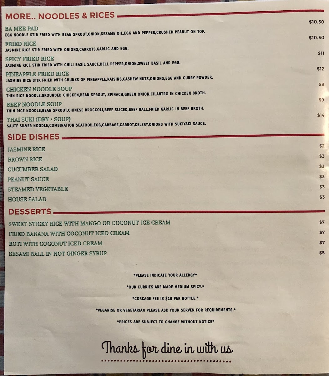 You'll find familiar favorites like Pad Thai and Green Curry alongside refreshing choices such as Papaya Salad and Thai Iced Coffee. Light starters like Crispy Spring Rolls or Crab Rangoon make a great beginning to a meal, while heartier options like Fried Whole Fish and Khao Soi with Chicken provide layers of rich, authentic taste for those seeking something more substantial.